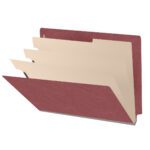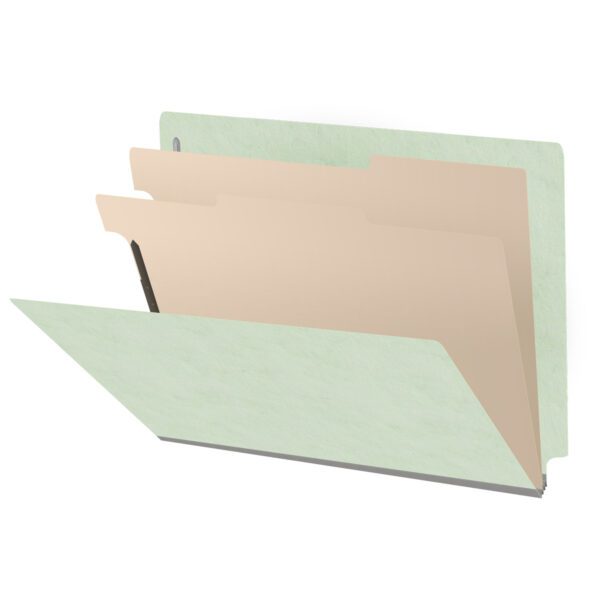 These end tab pressboard classification folders are designed to allow you to divide your documents into multiple sections. THESE FOLDERS WILL NOT FIT IN FILE DRAWERS. These end tab classification folders are designed for filing on shelves. Whether they are active or inactive records, pressboard folders are designed to stand up and last even in the most demanding environment. All pressboard products feature dove grey Tyvek expansions which allow the file to expand as needed. These 25 pt pale green pressboard folders also feature two 18 pt manila dividers with two bonded fasteners.