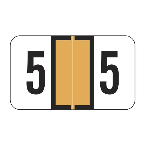 These are Safeguard compatible number “5” labels. Each label wraps around the end of a file folder to label that folder for numerical filing. They feature a wrap-around solid fluorescent orange color bar and a black color number “5” printed on a white background. The number “5” will be visible on each side of the folder when applied. Each label is 1-5/8″ wide and 15/16″ high. Labels are laminated and sold per roll of 500.