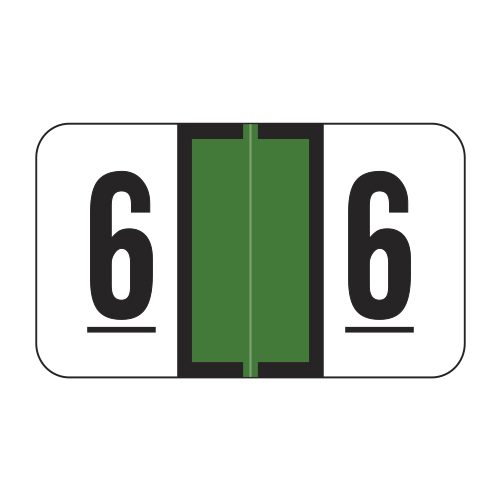 These are Safeguard compatible number “6” labels. Each label wraps around the end of a file folder to label that folder for numerical filing. They feature a wrap-around solid dark green color bar and a black color number “6” printed on a white background. The number “6” will be visible on each side of the folder when applied. Each label is 1-5/8″ wide and 15/16″ high. Labels are laminated and sold per roll of 500.