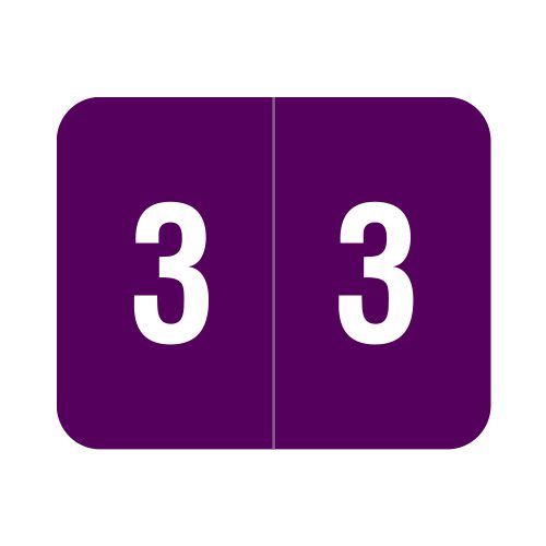 These are Smead DCCRN compatible number “3” labels. Each label wraps around the end of a file folder to label that folder for numerical filing. They feature a wrap-around solid purple bar with a solid white number “3”. The number “3” will be visible on each side of the folder when applied. Each label is 1-1/2″ wide and 1-1/2″ high. Labels are laminated and sold in rolls of 500.