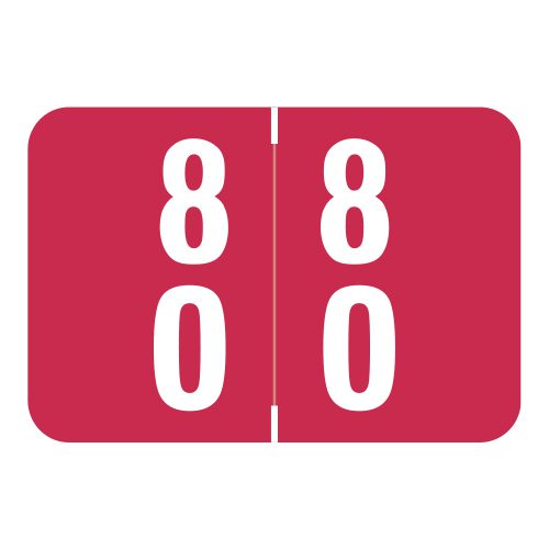 These are Smead DDS compatible double digit number “80” labels. Each label wraps around the end of a file folder to label that folder for numerical filing. They feature a wrap-around solid red color bar with a solid white number “80”. The number “80” will be visible on each side of the folder when applied. Each label is 1-1/2″ wide and 1″ high. Labels are laminated and sold in rolls of 500.