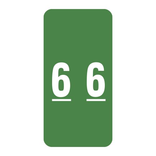 These are Smead LCC compatible number “6” labels. Each label wraps around the end of a file folder to label that folder for numerical filing. They feature a wrap-around solid green color bar with a solid white number “6”. The number “6” will be visible on each side of the folder when applied. Each label is 1″ wide and 2″ high. Labels are laminated and sold in rolls of 250.