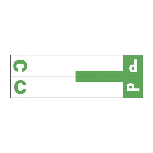 These are Smead SNCC compatible letter “CP” alpha labels. Each label wraps around the end of a file folder to label that folder for alphabetical filing. Each label has a solid dark green wrap around bar at one end with a letter “C” and letter “P” on the other end in solid color dark green, both the letters are visible on each side of the label. Each label is 3-5/8″ wide and 1-5/32″ high. Labels are laminated and sold in pack of 100.