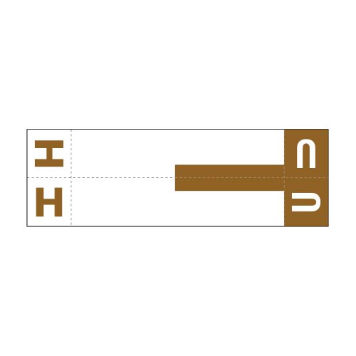 These are Smead SNCC compatible letter “HU” alpha labels. Each label wraps around the end of a file folder to label that folder for alphabetical filing. Each label has a solid brown wrap around bar at one end with a letter “H” and letter “U” on the other end in solid color brown, both the letters are visible on each side of the label. Each label is 3-5/8″ wide and 1-5/32″ high. Labels are laminated and sold in pack of 100.