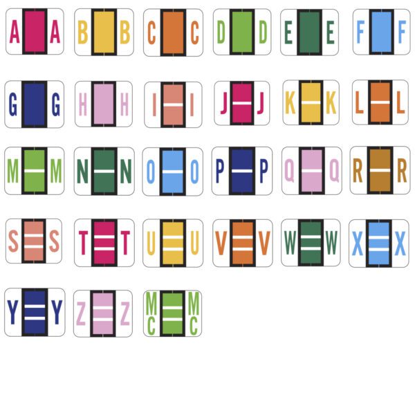 These are Tab 1283 Compatible letter A-Z set tray with MC alpha labels. Each label wraps around the end of a file folder to label that folder for alphabetical filing. They feature a wrap-around solid color bar with a solid alphabet. The letter will be visible on each side of the folder when applied. Each label is 1″ wide and 1-1/4″ high. Labels are laminated and sold in 27 rolls of 500.