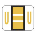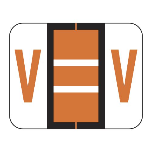These are Tab 1286 Compatible letter “V” alpha labels. Each label wraps around the end of a file folder to label that folder for alphabetical filing. They feature a wrap-around solid dark orange bar with a solid “V” character. The letter “V” will be visible on each side of the folder when applied. Each label is 1″ wide and 1-1/4″ high. Labels are laminated and sold in sheet of 50.