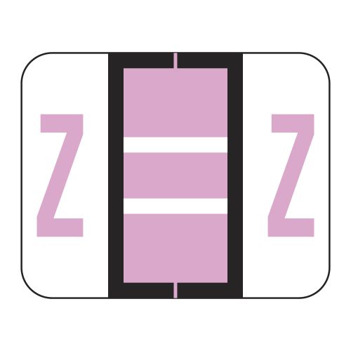 These are Tab 1286 Compatible letter “Z” alpha labels. Each label wraps around the end of a file folder to label that folder for alphabetical filing. They feature a wrap-around solid lilac bar with a solid “Z” character. The letter “Z” will be visible on each side of the folder when applied. Each label is 1″ wide and 1-1/4″ high. Labels are laminated and sold in sheet of 50.