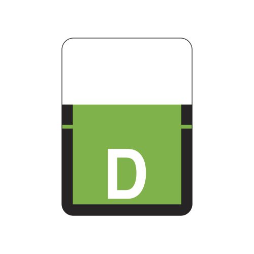 These are Tab 1307 Compatible letter “D” alpha labels. Each label wraps around the top of a file folder to label that folder for alphabetical filing. They feature a wrap-around solid light green bar with a solid “D” character. The letter “D” will be visible on each side of the folder when applied. Each label is 1″ wide and 3/4″ high. Labels are laminated and sold in roll of 500.