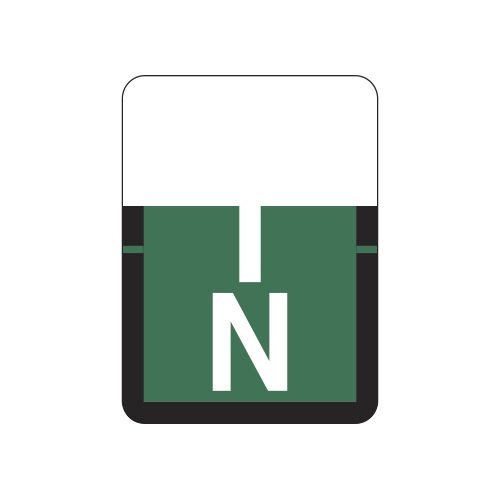 These are Tab 1307 Compatible letter “N” alpha labels. Each label wraps around the top of a file folder to label that folder for alphabetical filing. They feature a wrap-around solid dark green bar with a solid “N” character. The letter “N” will be visible on each side of the folder when applied. Each label is 1″ wide and 3/4″ high. Labels are laminated and sold in roll of 500.