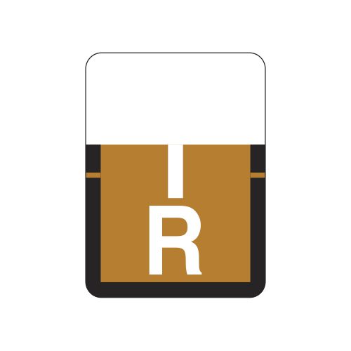 These are Tab 1307 Compatible letter “R” alpha labels. Each label wraps around the top of a file folder to label that folder for alphabetical filing. They feature a wrap-around solid brown bar with a solid “R” character. The letter “R” will be visible on each side of the folder when applied. Each label is 1″ wide and 3/4″ high. Labels are laminated and sold in roll of 500.