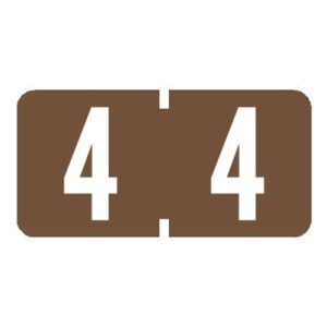 These are Tab Mini 1280 compatible number “4” labels. Each label wraps around the end of a file folder to label that folder for numerical filing. They feature a wrap-around solid brown color bar with a solid white “4”. The number “4” will be visible on each side of the folder when applied. Each label is 1″ wide and 1/2″ high. Labels are vinyl and sold in rolls of 1,000.