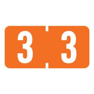These are Tab Mini 1277 compatible number “3” labels. Each label wraps around the end of a file folder to label that folder for numerical filing. They feature a wrap-around solid dark orange color bar with a solid white “3”. The number “3” will be visible on each side of the folder when applied. Each label is 1″ wide and 1/2″ high. Labels are vinyl and sold in rolls of 500.