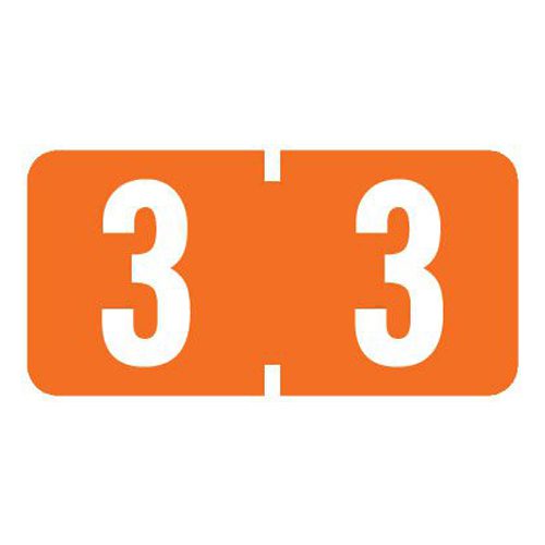 These are Tab Mini 1277 compatible number “3” labels. Each label wraps around the end of a file folder to label that folder for numerical filing. They feature a wrap-around solid dark orange color bar with a solid white “3”. The number “3” will be visible on each side of the folder when applied. Each label is 1″ wide and 1/2″ high. Labels are vinyl and sold in rolls of 500.