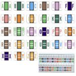 - Each label features a solid color alpha character on a white background on each side of the label.