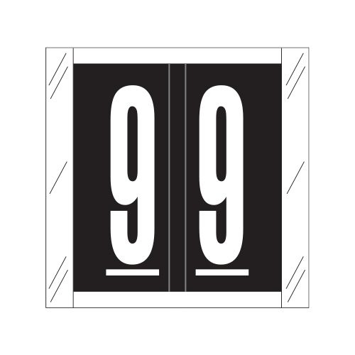These are Tabbies 11500 compatible “9” numeric labels. Each label wraps around the end of a file folder to label that folder for numerical filing. They feature a wrap-around solid black color bar with a solid white “9”. The “9” will be visible on each side of the folder when applied. Each label is 1-1/2″ wide and 1-1/2″ high. Labels are laminated and sold in rolls of 500.
