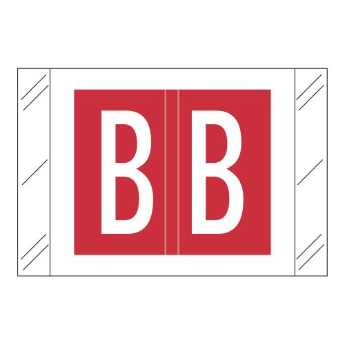 These are Tabbies 12000 Compatible Letter “B” Alpha Labels. Each label wraps around the end of a file folder to label that folder for alphabetical filing. These labels are solid red with a double white letter “B” character. The “B” will be visible on each side of the folder when applied. Each label is 1″ wide x 1-1/2″ high. Labels are laminated and sold in roll of 500.