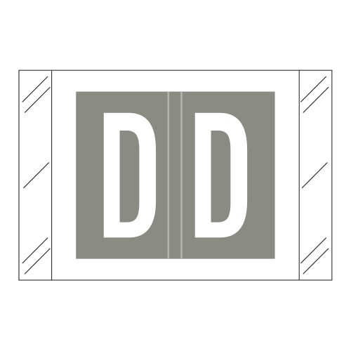 These are Tabbies 12000 Compatible Letter “D” Alpha Labels. Each label wraps around the end of a file folder to label that folder for alphabetical filing. These labels are solid grey with a double white letter “D” character. The “D” will be visible on each side of the folder when applied. Each label is 1″ wide x 1-1/2″ high. Labels are laminated and sold in roll of 500.