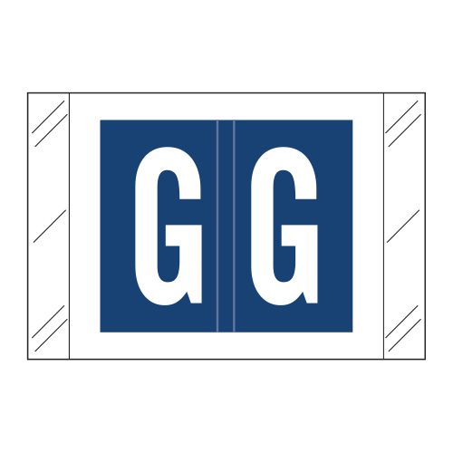 These are Tabbies 12000 Compatible Letter “G” Alpha Labels. Each label wraps around the end of a file folder to label that folder for alphabetical filing. These labels are solid royal blue with a double white letter “G” character. The “G” will be visible on each side of the folder when applied. Each label is 1″ wide x 1-1/2″ high. Labels are laminated and sold in roll of 500.