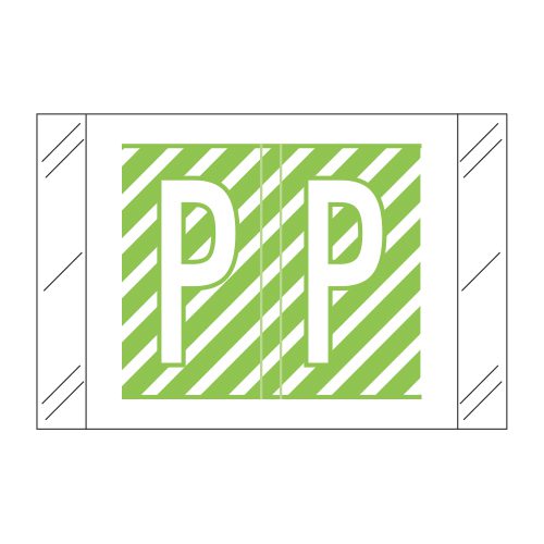 These are Tabbies 12000 Compatible Letter “P” Alpha Labels. Each label wraps around the end of a file folder to label that folder for alphabetical filing. These labels are striped light green with a double white letter “P” character. The “P” will be visible on each side of the folder when applied. Each label is 1″ wide x 1-1/2″ high. Labels are laminated and sold in roll of 500.