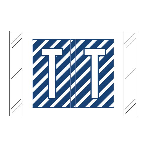 These are Tabbies 12000 Compatible Letter “T” Alpha Labels. Each label wraps around the end of a file folder to label that folder for alphabetical filing. These labels are striped royal blue with a double white letter “T” character. The “T” will be visible on each side of the folder when applied. Each label is 1″ wide x 1-1/2″ high. Labels are laminated and sold in roll of 500.