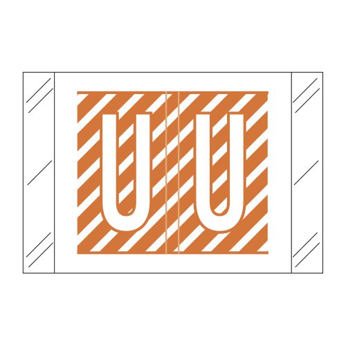 These are Tabbies 12000 Compatible Letter “U” Alpha Labels. Each label wraps around the end of a file folder to label that folder for alphabetical filing. These labels are striped orange with a double white letter “U” character. The “U” will be visible on each side of the folder when applied. Each label is 1″ wide x 1-1/2″ high. Labels are laminated and sold in roll of 500.