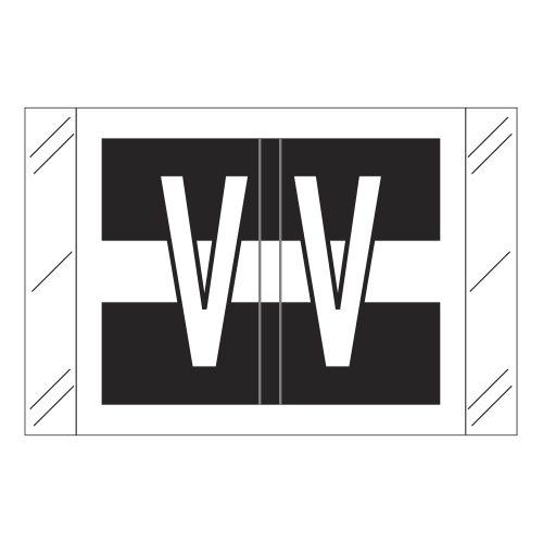These are Tabbies 12030 Compatible Letter “V” Alpha Labels. Each label wraps around the end of a file folder to label that folder for alphabetical filing. These labels are solid black with a double white letter “V” character. The “V” will be visible on each side of the folder when applied. Each label is 1″ wide x 1-1/2″ high. Labels are laminated and sold in roll of 500.