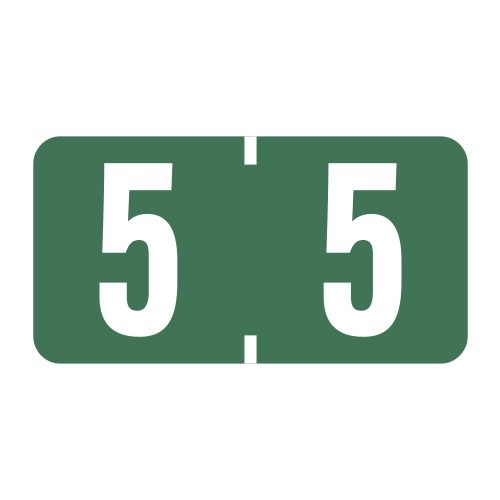 These are TBNV compatible number “5” labels. Each label wraps around the end of a file folder to label that folder for numerical filing. They feature a wrap-around solid dark green color bar with a solid white “5”. The number “5” will be visible on each side of the folder when applied. Each label is 1″ wide and 1/2″ high. Labels are vinyl and sold in rolls of 500.