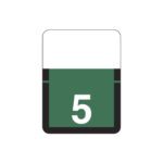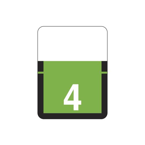 These are Tab 1306 compatible number “4” labels. Each label wraps around the top of a file folder to label that folder for numerical filing. They feature a wrap-around solid light green color bar with a solid white “4”. The number “4” will be visible on each side of the folder when applied. Each label is 3/4″ wide and 1″ high. Labels are vinyl and sold in rolls of 500.