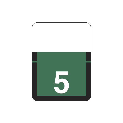 These are Tab 1306 compatible number “5” labels. Each label wraps around the top of a file folder to label that folder for numerical filing. They feature a wrap-around solid dark green color bar with a solid white “5”. The number “5” will be visible on each side of the folder when applied. Each label is 3/4″ wide and 1″ high. Labels are vinyl and sold in rolls of 500.
