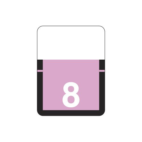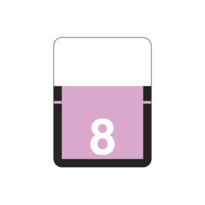These are Tab 1306 compatible number “8” labels. Each label wraps around the top of a file folder to label that folder for numerical filing. They feature a wrap-around solid lilac color bar with a solid white “8”. The number “8” will be visible on each side of the folder when applied. Each label is 3/4″ wide and 1″ high. Labels are vinyl and sold in rolls of 500.