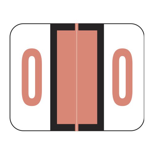 These are TPNV compatible number “0” labels. Each label wraps around the end of a file folder to label that folder for numerical filing. They feature a wrap-around solid pink color bar and a matching color “0” printed on a white background. The number “0” will be visible on each side of the folder when applied. Each label is 1-1/4″ wide and 1″ high. Labels are laminated and sold per roll of 500.